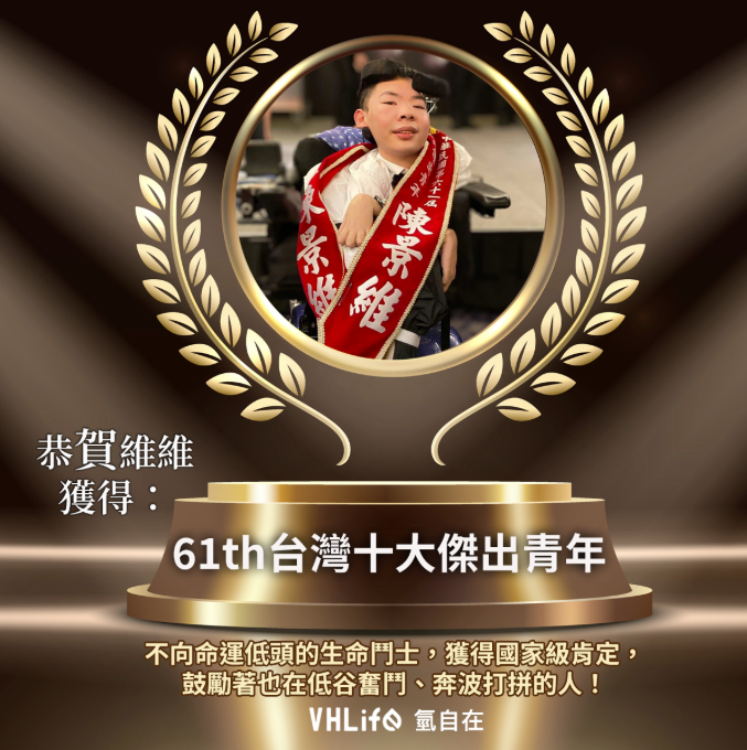 VHLife氫自在長期關注與支持的宜蘭囝仔-「維維」陳景維,榮獲第61屆台灣十大傑出青年。維維出生後被診斷為罹患罕見疾病「脊髓性肌肉萎縮症」,雖自小父母離異,行動不便,成長路程艱辛,但他讀完大學、考取多張證照、出書、上TED演說,努力把握每一天,活出每一刻的精彩!