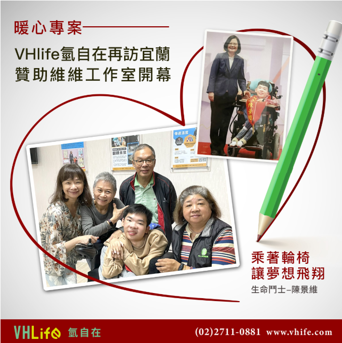 維維非常珍惜VHlife氫自在的支持就學,在就學期間考取6張電腦專業證,並成為生命教育的講師,到各地分享。2020年獲總統教育獎,2022年更受到衛福部全國身心障礙楷模金鷹獎殊榮肯定。 畢業後,維維開設【Wheelchair 維兒洽】整合行銷工作室,我們去了宜蘭送上紅包,與他一同慶祝開幕!