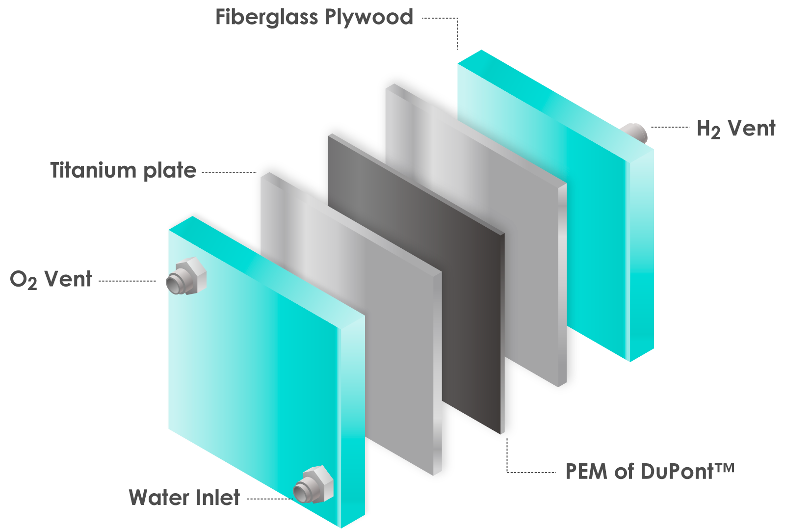 Our state-of-art design apply Proton Exchange Membrane(PEM)of DuPont™ to our hydrogen-production core as solid electrolyte, together with membrane electrode assembly, the core electrolyzes distilled water(H2O)to only pure H2 and O2, and could be understood as the reverse reaction of Proton Exchange Membrane Fuel Cell(PEMFC).