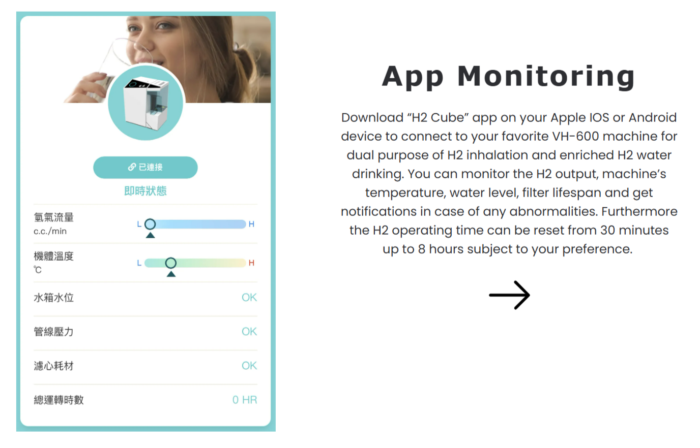 Download “H2 Cube” app on your Apple IOS or Android device to connect to your favorite VH-600 machine. You can monitor the H2 output, machine’s temperature, water level, filter lifespan and get notifications in case of any abnormalities. Furthermore the H2 operating time can be reset from 30 minutes up to 8 hours subject to your preference.