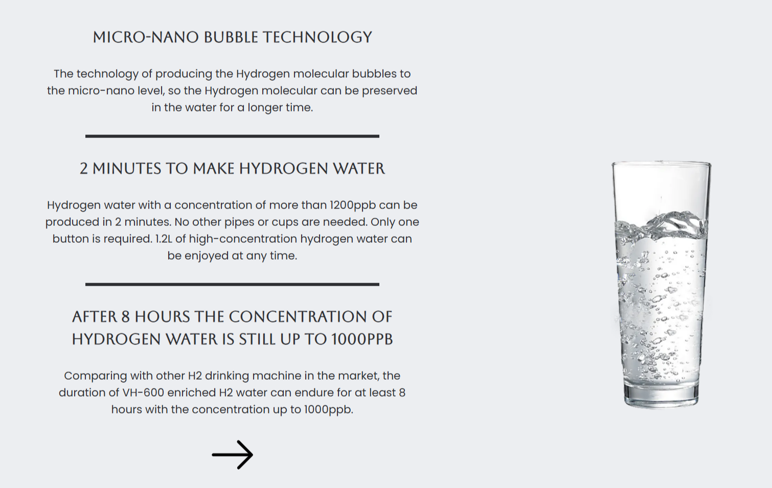Comparing with other H2 drinking machine in the market, the duration of VH-600 enriched H2 water can endure for at least 8 hours with the concentration up to 1000ppb.