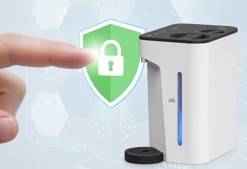 使用微電腦控制系統,飲用氫水時,皆需按壓解鎖鍵後,再按出水鍵,才能取用。未使用時,會重新上鎖,預防因誤觸造成危險。